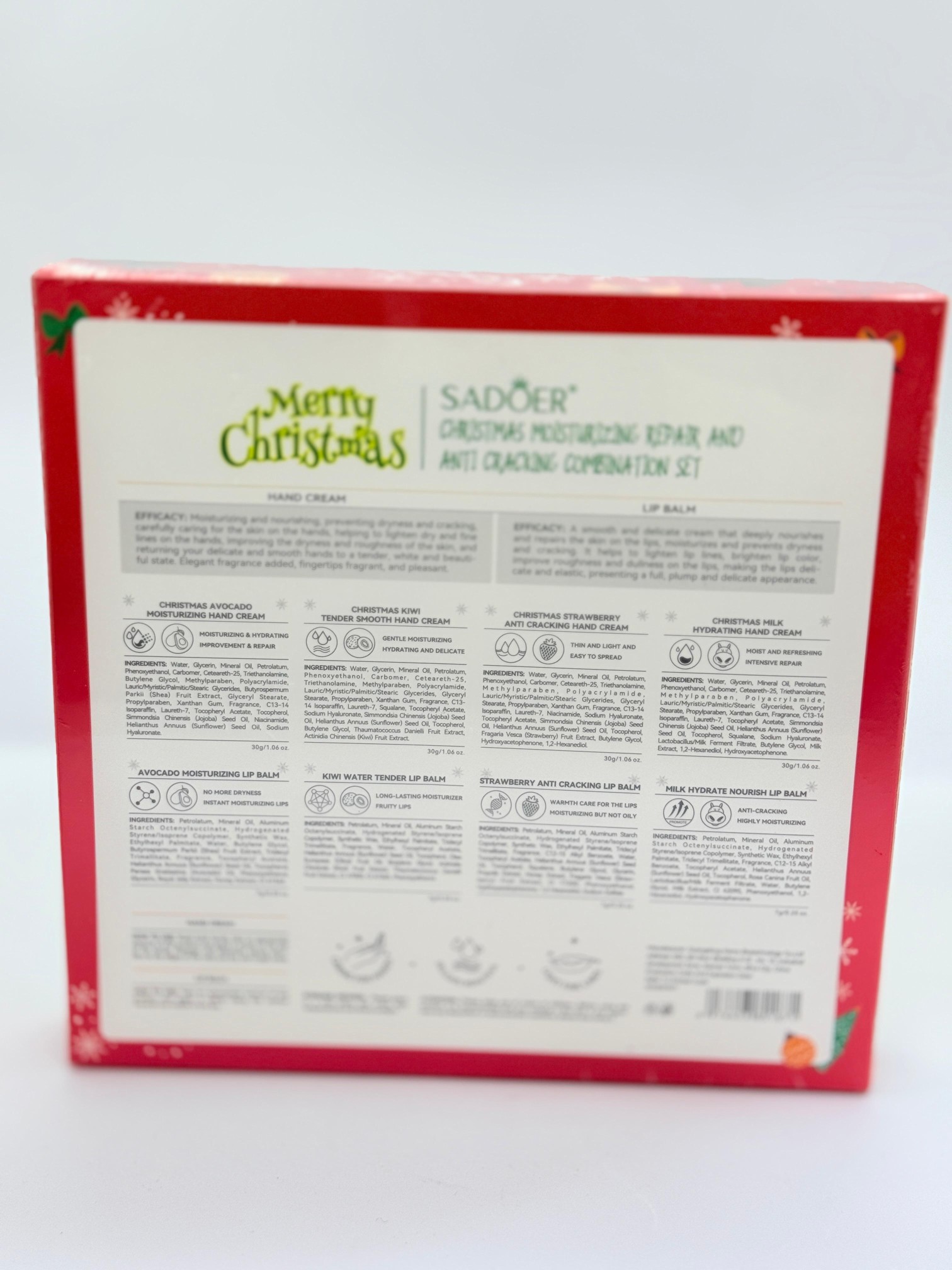Sadoer Christmas Hand Cream & Lip Balm Set هو مجموعة كريم لليدين وبلسم الشفاه تساعد على ترطيب اليدين والشفتين بعمق وحمايتهما من الجفاف، خاصة في فصل الشتاء. تركيبة المجموعة تعمل على تنعيم البشرة والشفتين وتركها رطبة ومريحة مع رائحة عطرية لطيفة تمنح شعورًا بالدفء والراحة. مناسبة لجميع أنواع البشرة وتضيف لمسة احتفالية ومميزة لهدية أو استخدام شخصي.